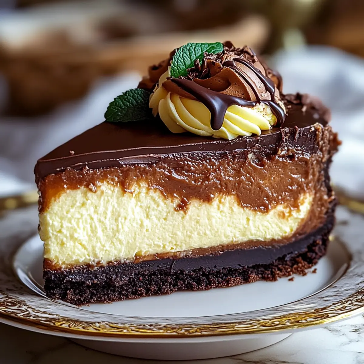 Caramel Sauce: A drizzle of caramel sauce adds golden sweetness and a contrasting flavor layer that enhances the biscuit crust and rich ganache above.