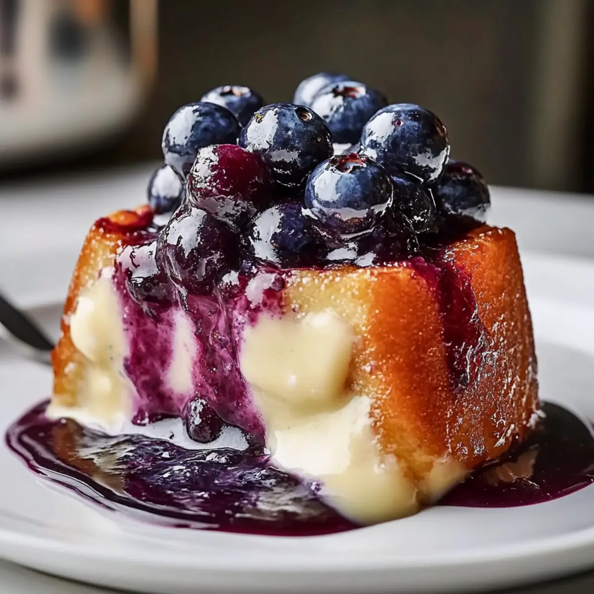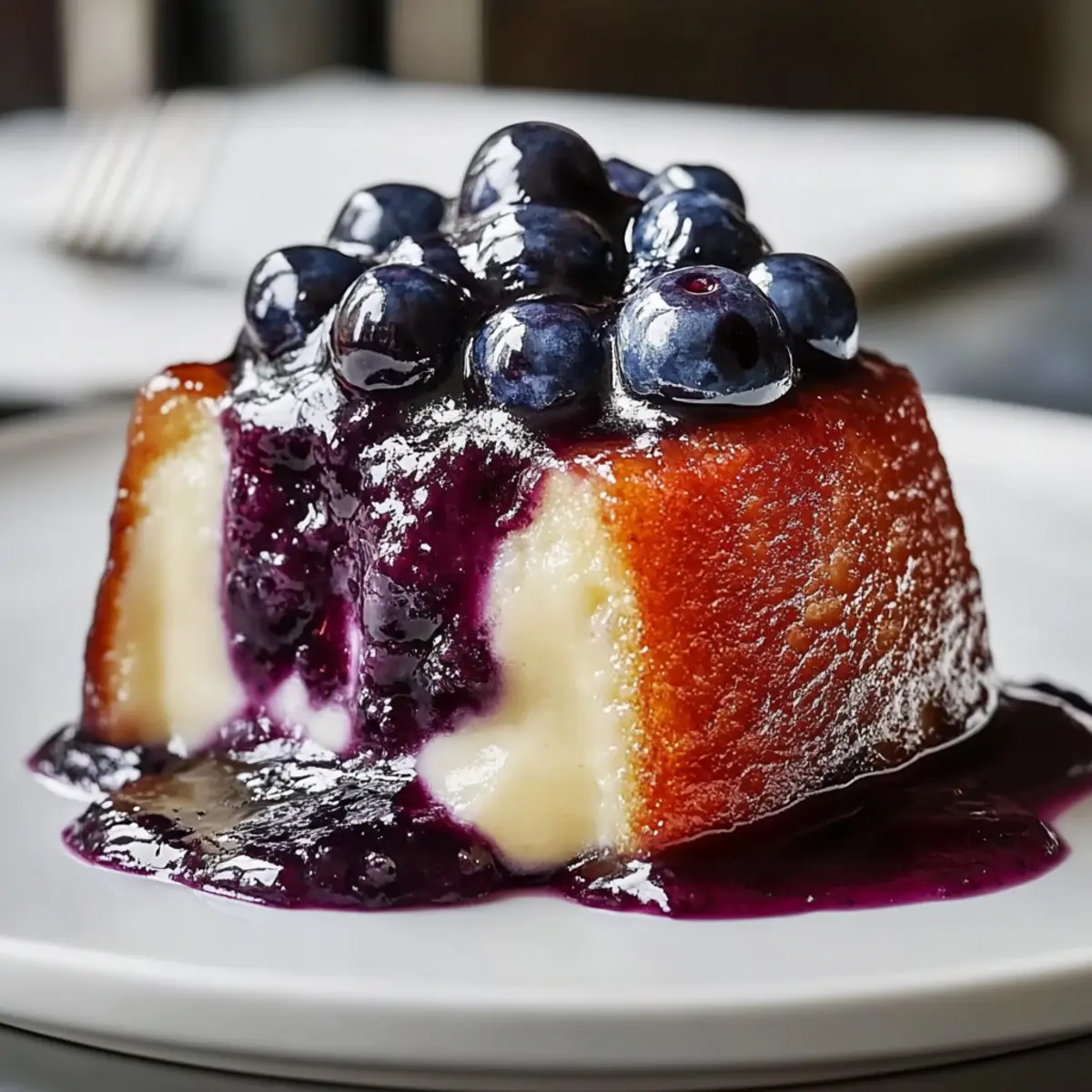 Comforting, delightful experience: This Blueberry Malva Pudding is like a warm hug on a chilly night, enveloped in creamy vanilla custard.