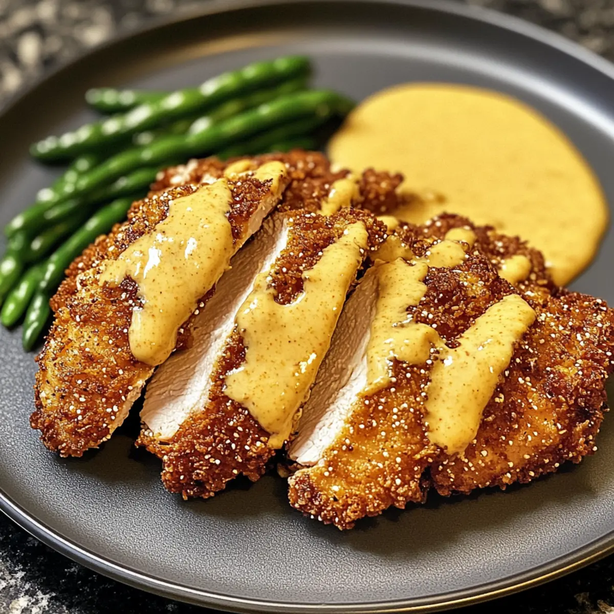 Crispy Pretzel Crusted Chicken with Creamy Cheddar Sauce