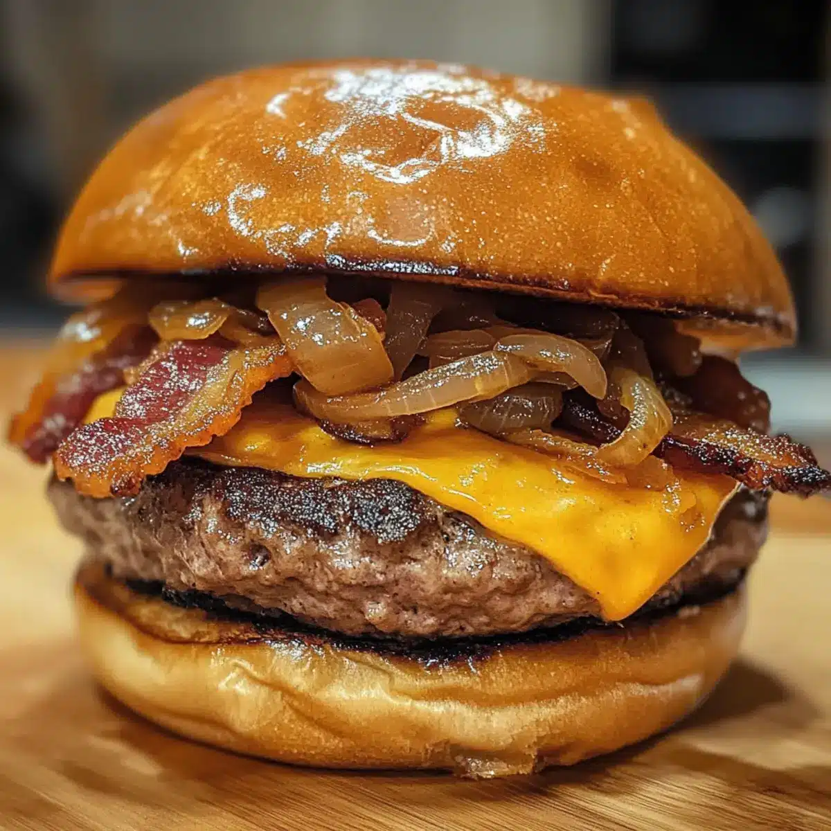 Mouthwatering Irish Pub Burger with Guinness Onions and Bacon