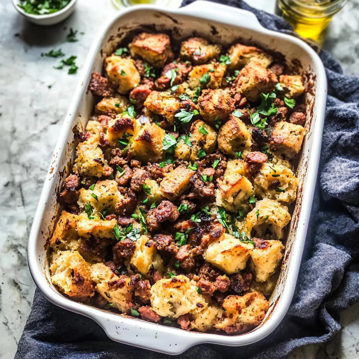 Not to worry! If your stuffing turns out too dry, you can drizzle a bit more chicken stock or olive oil over it and gently mix to add moisture. If it’s too wet, try baking it a little longer uncovered to crisp it up. You can also mix in a handful of breadcrumbs to help absorb excess moisture.