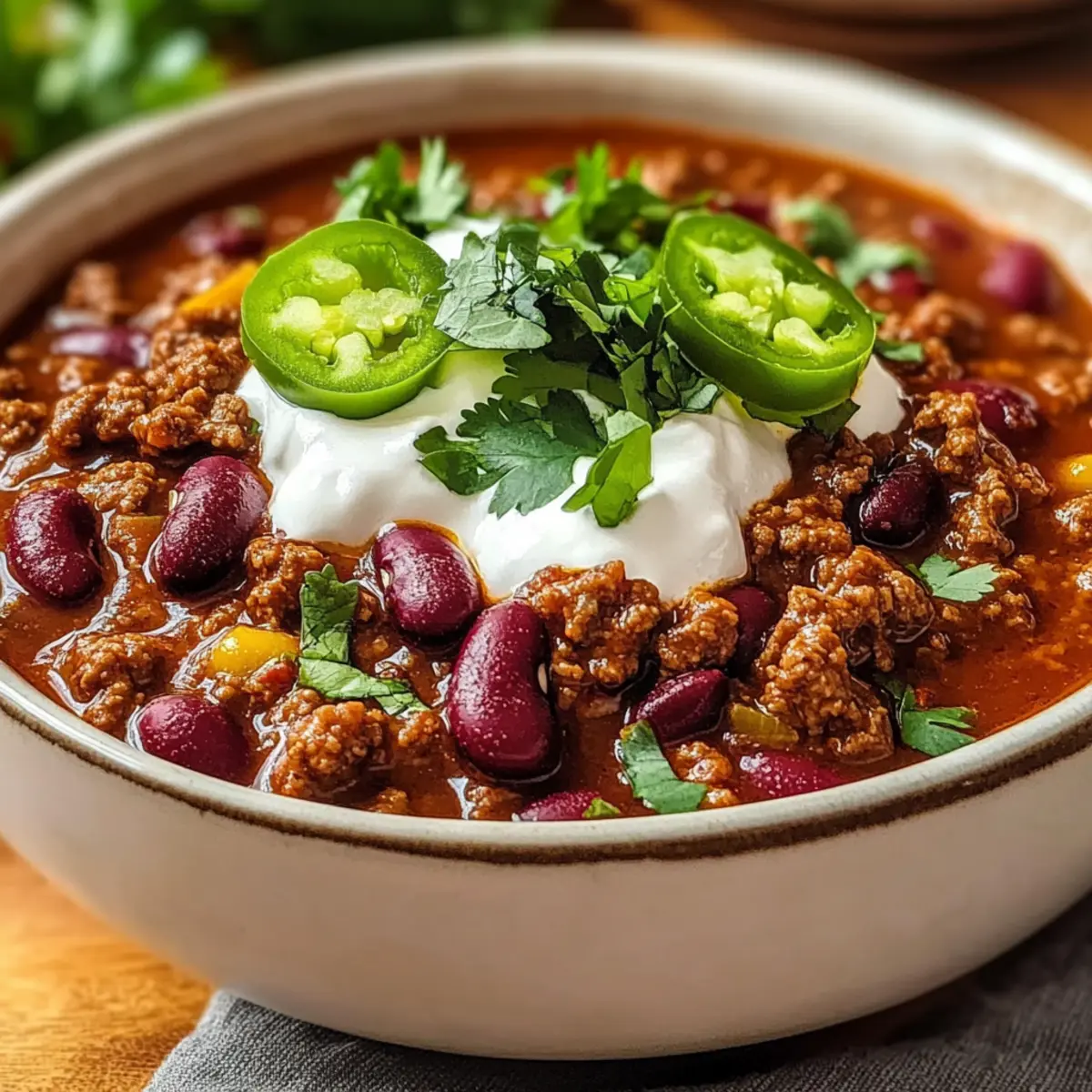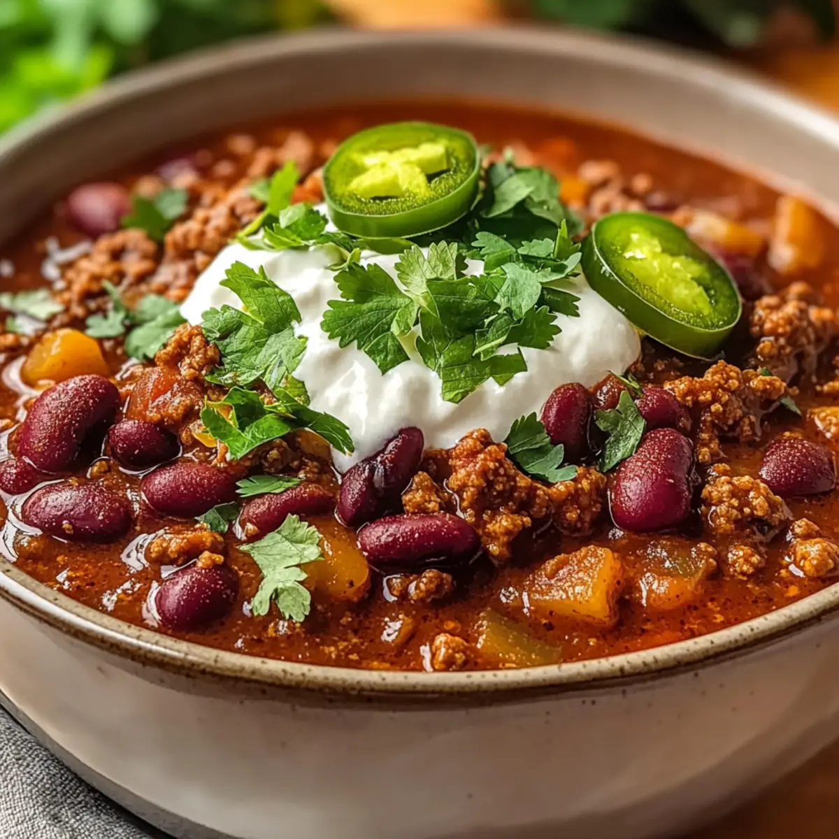 - No-Bean Chili: For a thicker chili, omit the beans and add more ground beef or dice up some bell peppers and zucchini.