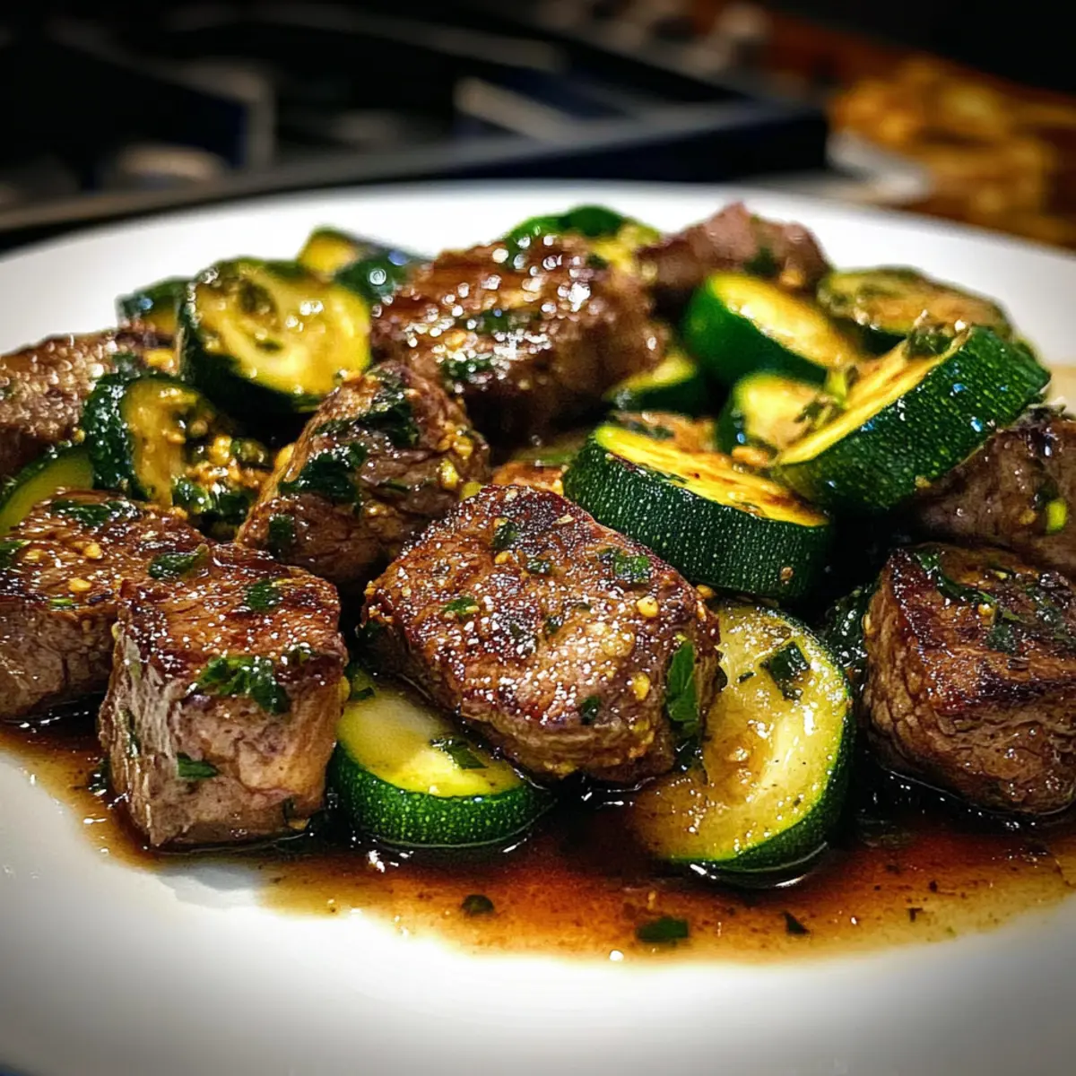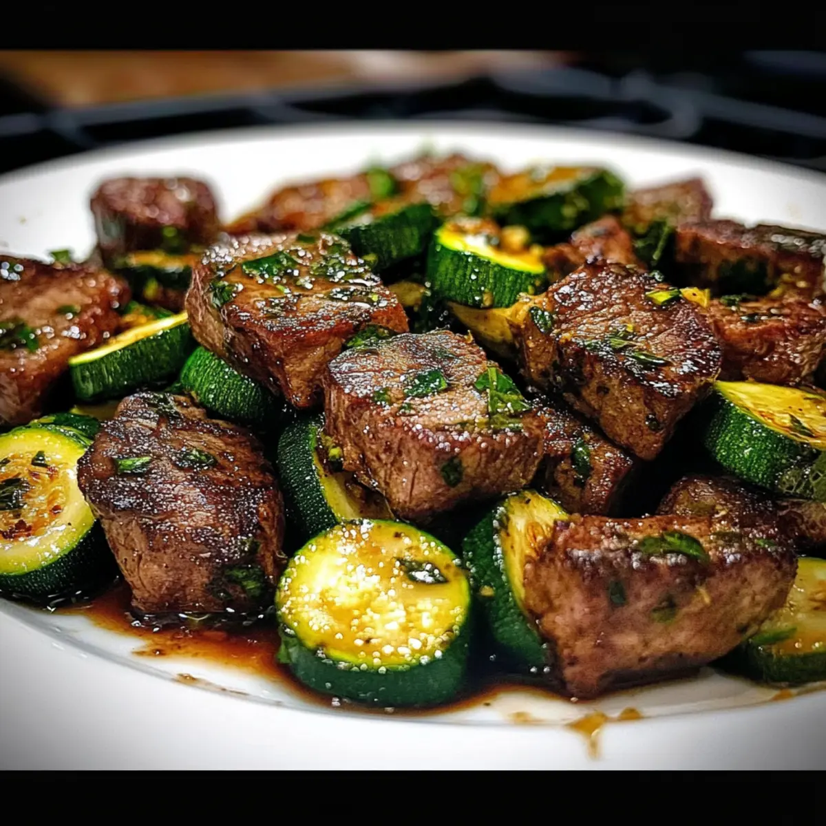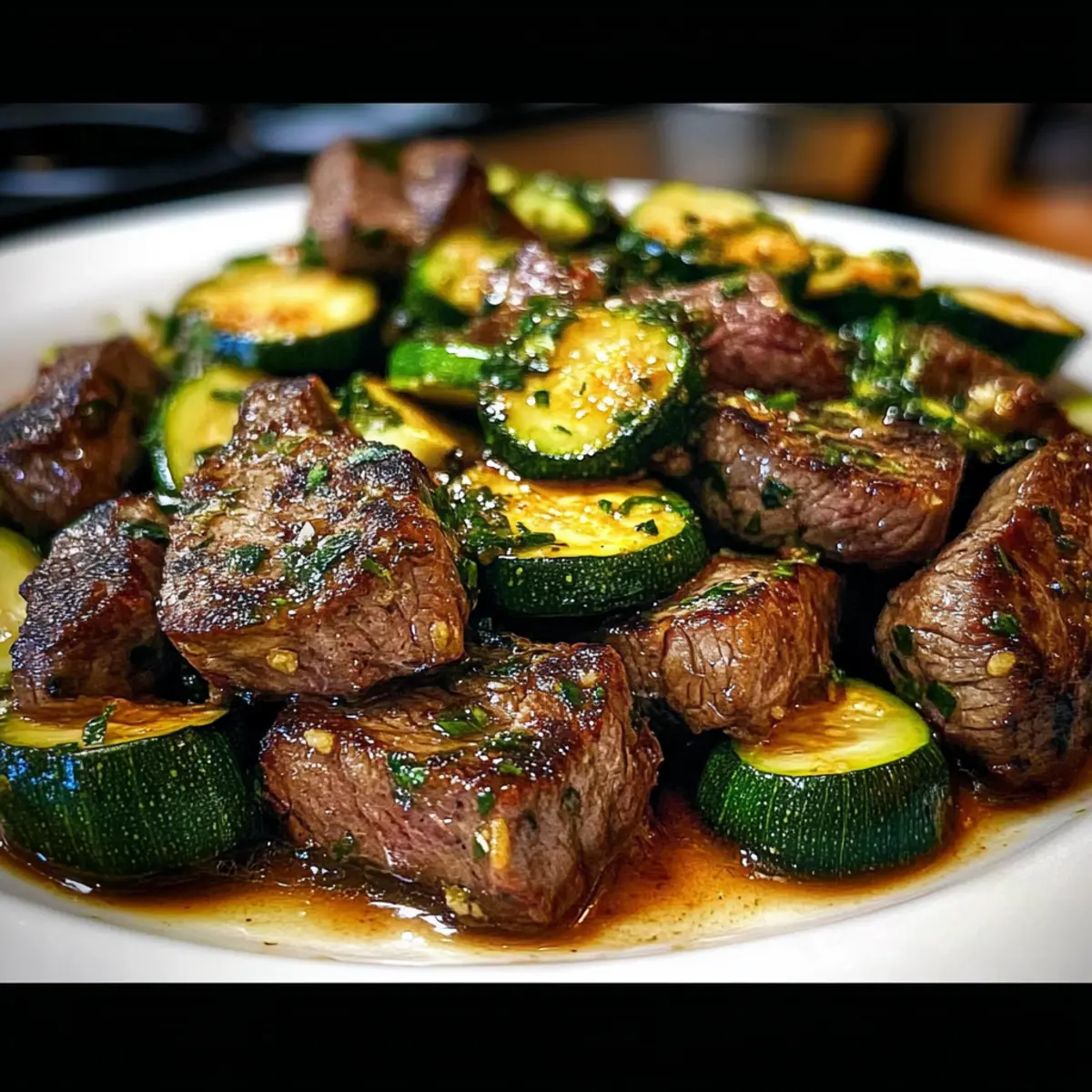 Return the seared steak bites to the skillet with the zucchini. Toss everything together gently, allowing the flavors to meld as they heat through for an additional 1-2 minutes. The garlic butter should evenly coat the tender steak and zucchini, creating a luscious, satisfying dish—your garlic butter steak bites are almost ready!