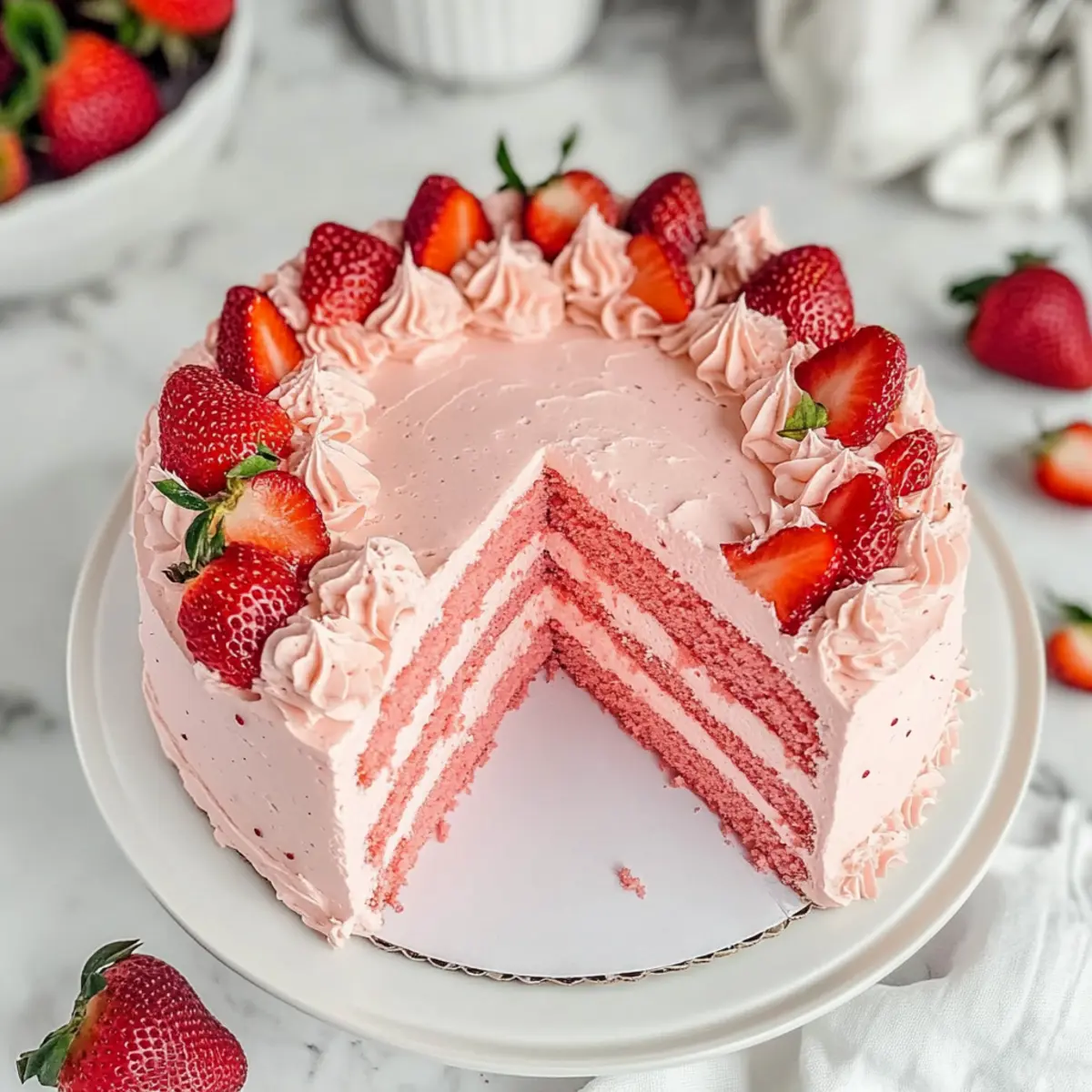 Berry Compote: Drizzle a warm or chilled berry compote over each slice for added sweetness and depth, tying in with the cake’s strawberry flavor beautifully.