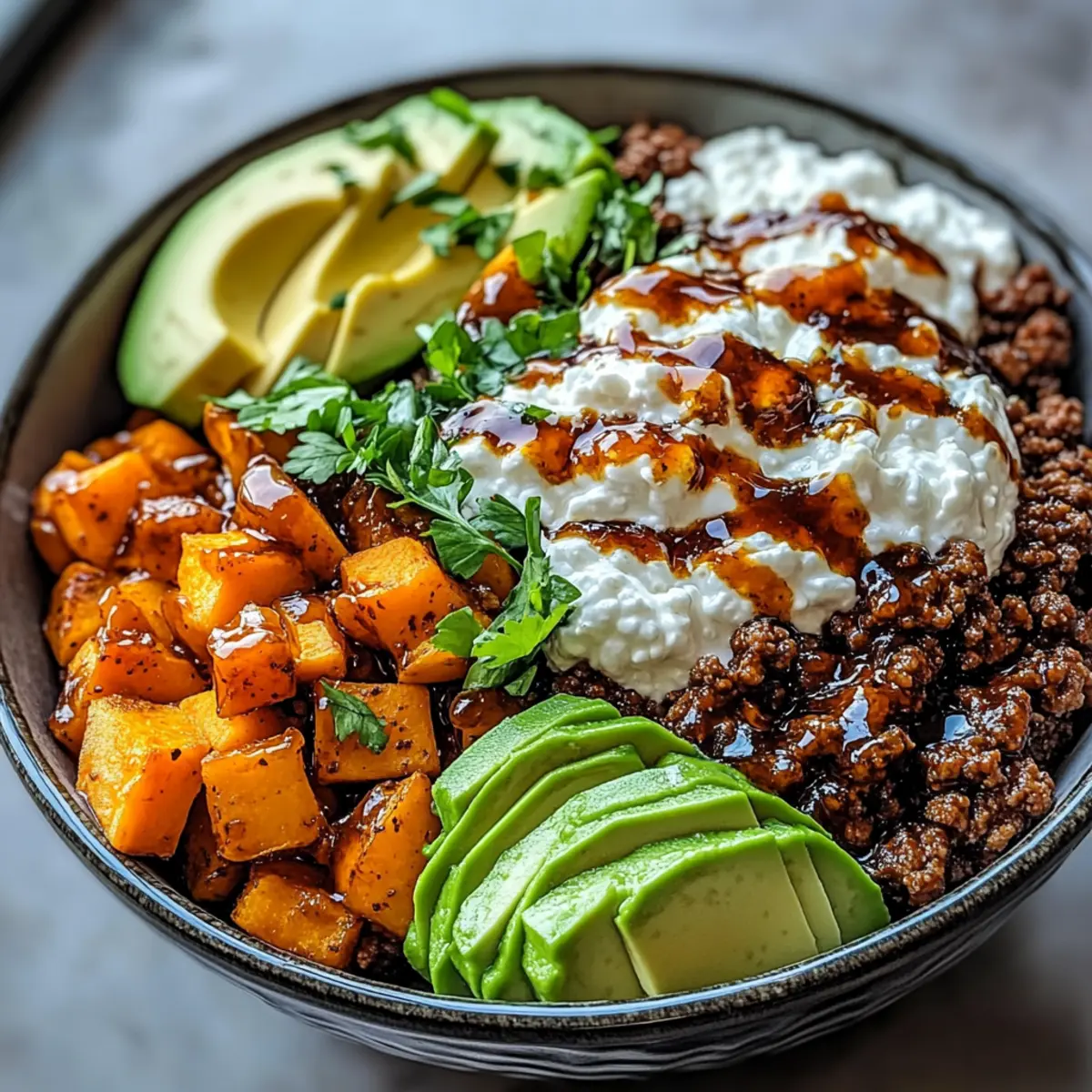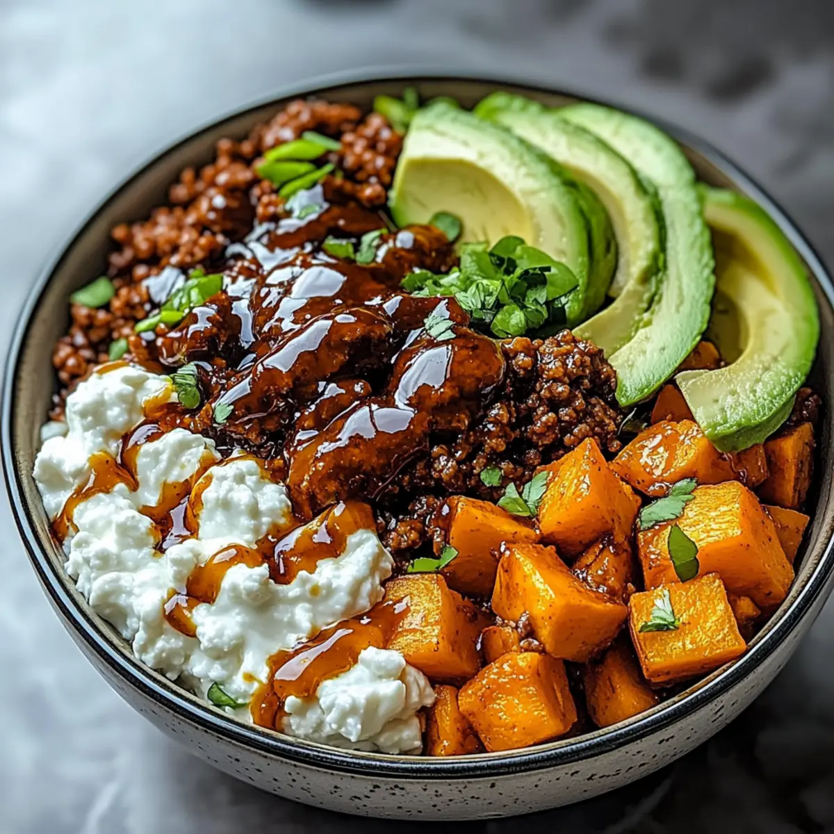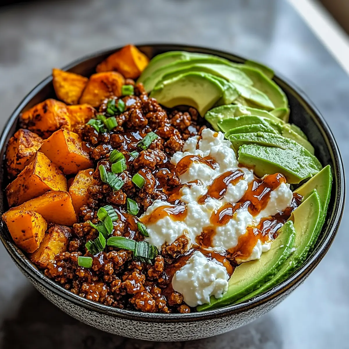 In serving bowls, create a hearty layer starting with the tender sweet potatoes. Top with the savory beef mixture, followed by 1 cup of creamy cottage cheese for richness. Add sliced avocado on top, providing freshness and a beautiful presentation that invites everyone to dig into their Ground Beef Hot Honey Bowl.