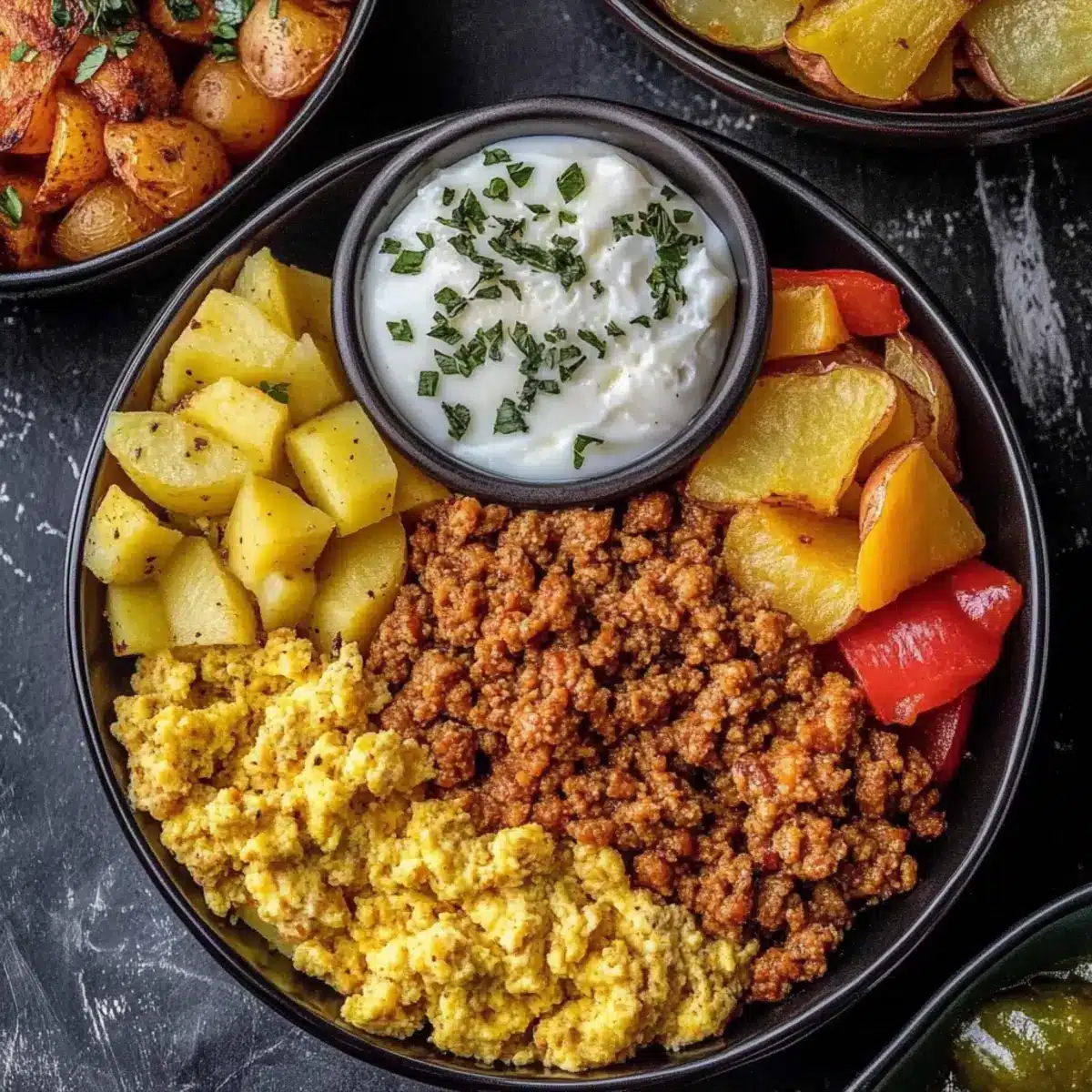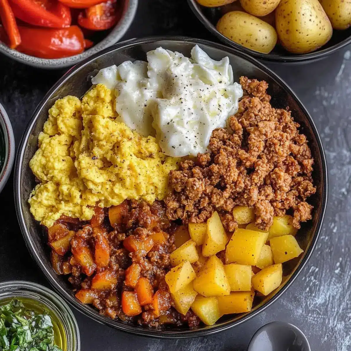 As I stood in my kitchen, the warm aroma of roasted peppers and sweet, spicy ground chicken danced around me, reminding me of sun-soaked Tex-Mex mornings. It’s amazing how a bowl can evoke such fond memories! Today, I’m sharing my Healthy Meal Prep Breakfast Bowls, designed for those busy mornings when you crave a satisfying meal but want to keep it nutritious. Each bowl combines fluffy scrambled eggs, hearty roasted potatoes, and vibrant bell peppers, packing in an impressive 42 grams of protein while keeping carbs at a friendly 31 grams. Not only are these bowls a delicious and customizable option for any breakfast lover, but they’re also perfect for meal prep aficionados looking to sprinkle some excitement into their week. Curious about how to whip up this colorful dish that’s as tasty as it is nourishing? Let’s dig in!