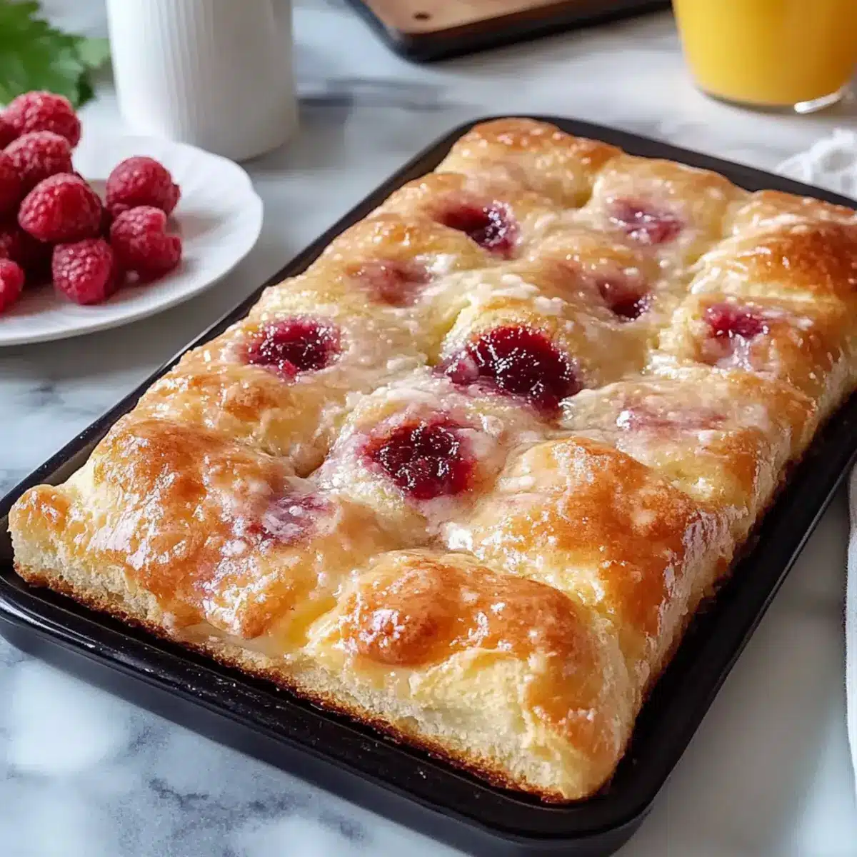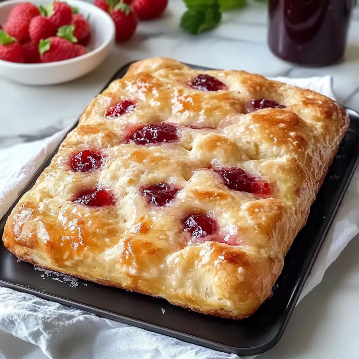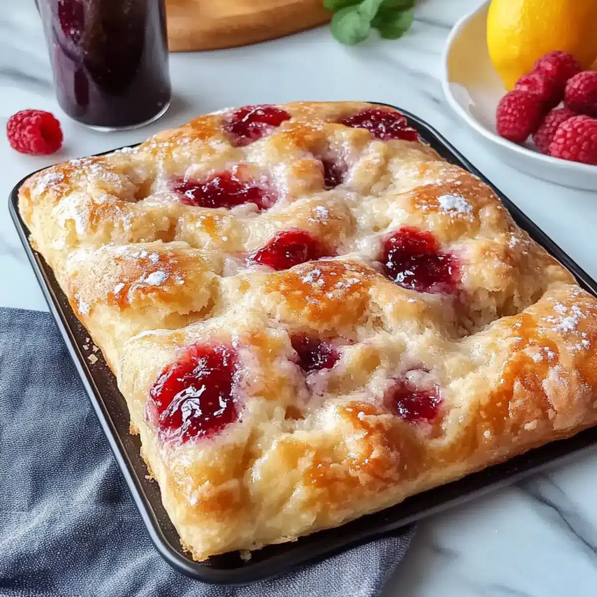 Once out of the oven, allow the focaccia to cool slightly for about 5 minutes. Poke additional holes into the warm bread using your fingers and fill these pockets with a bit more raspberry preserves. This step introduces extra gooey goodness that will make every bite delightful!
