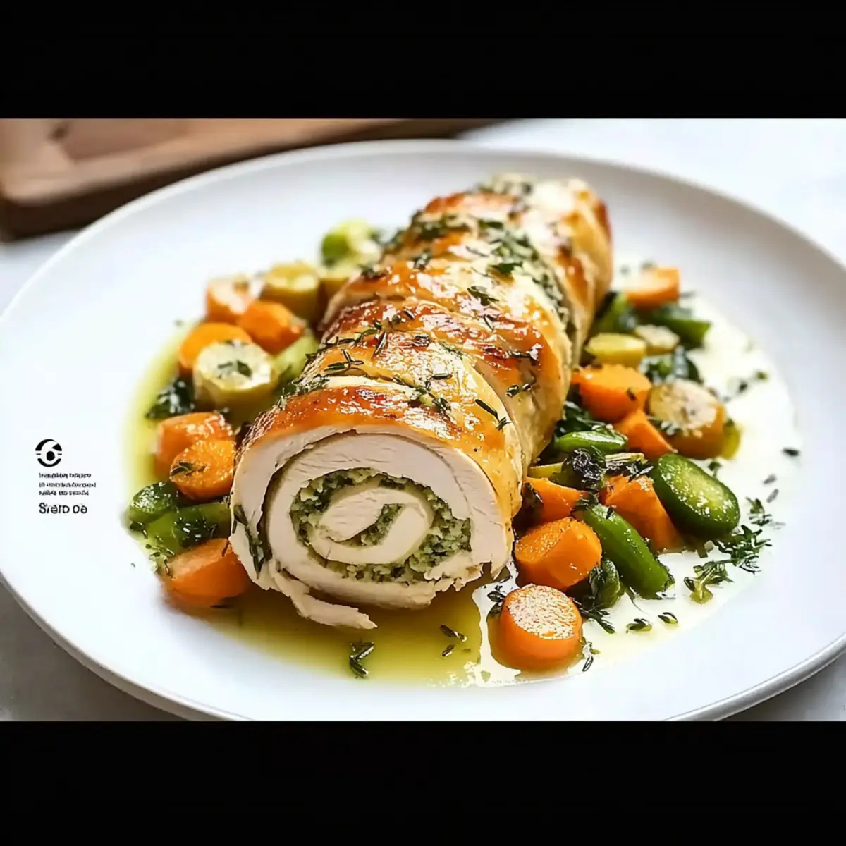 - Slice the roulade into medallions and arrange on a plate, drizzled with the lemon thyme sauce and served with sautéed seasonal vegetables.