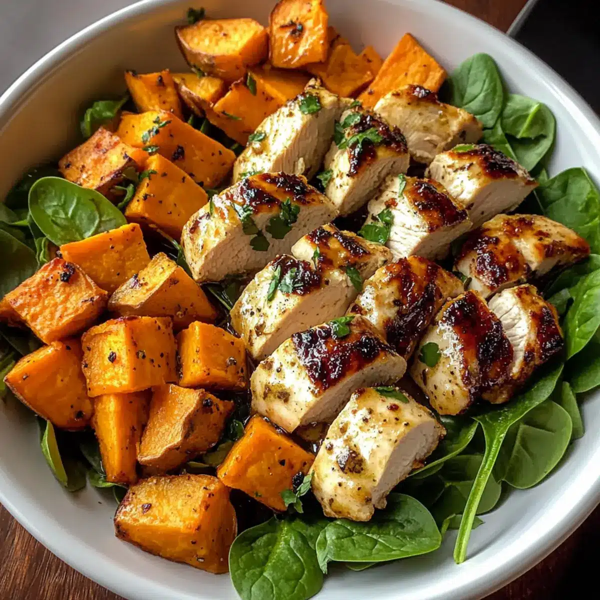 - To assemble, divide roasted sweet potatoes and saucy chicken among bowls. Add fresh spinach leaves around the edges.