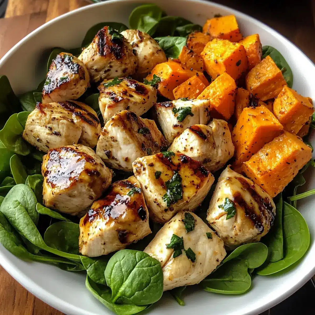 To create your Maple Dijon Chicken & Sweet Potato Bowls, divide the roasted sweet potatoes and saucy chicken among bowls. Place fresh spinach leaves around the edges for a pop of color and nutrition. The vibrant greens will complement the warm flavors beautifully, creating a visually appealing and wholesome dish.