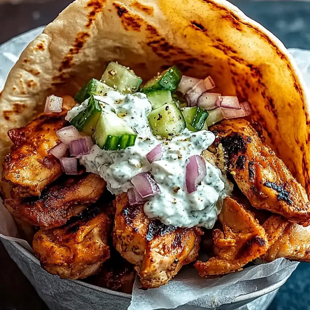 - Warm pita bread, fill with chicken, drizzle with tzatziki, and add any desired toppings.