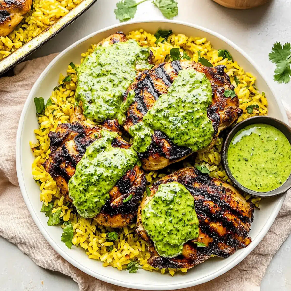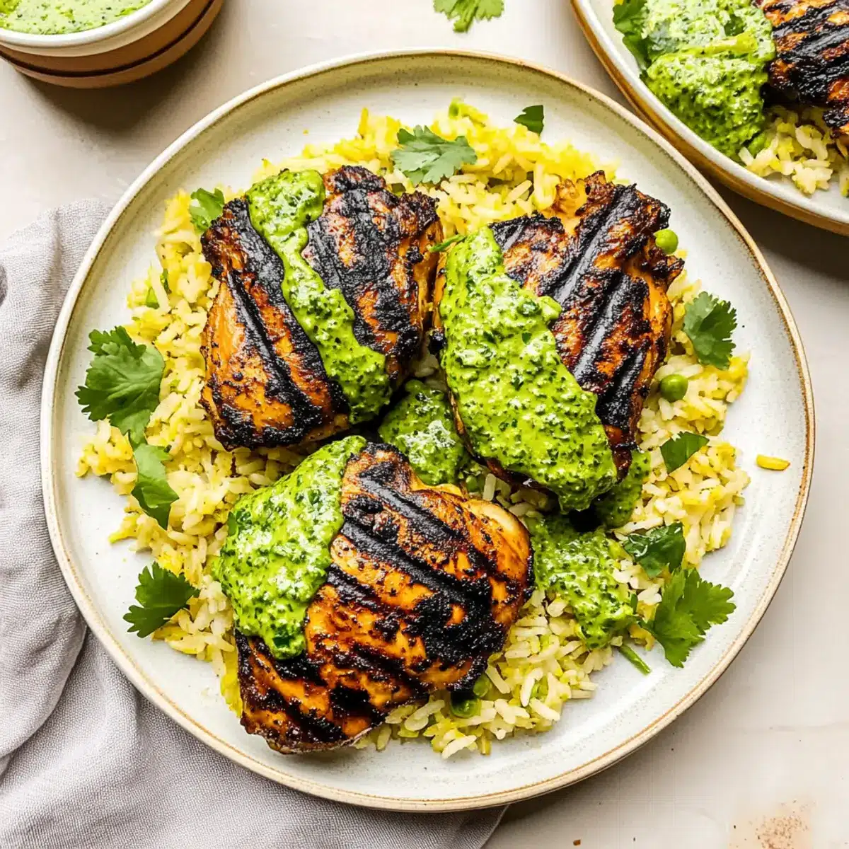 - On each plate, create a bed of the fluffy jasmine rice, then top it with grilled chicken. Generously drizzle the creamy green sauce over the chicken and rice.