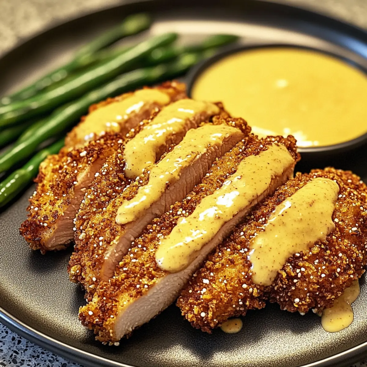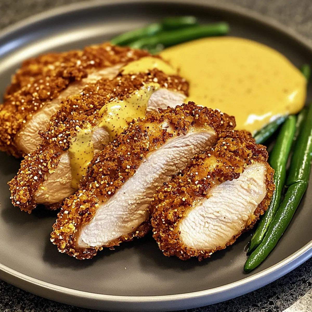Once the pretzel crusted chicken is cooked to perfection, remove it from the oven or skillet. Plate the chicken, drizzle generously with the creamy cheddar mustard sauce, and garnish with chopped parsley or some extra crushed pretzels. The final result should showcase a delightful crispy exterior and tender chicken inside, ready to delight your family!