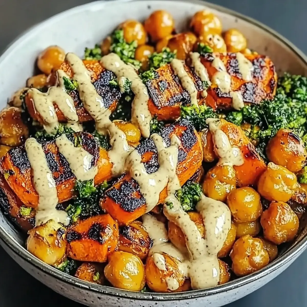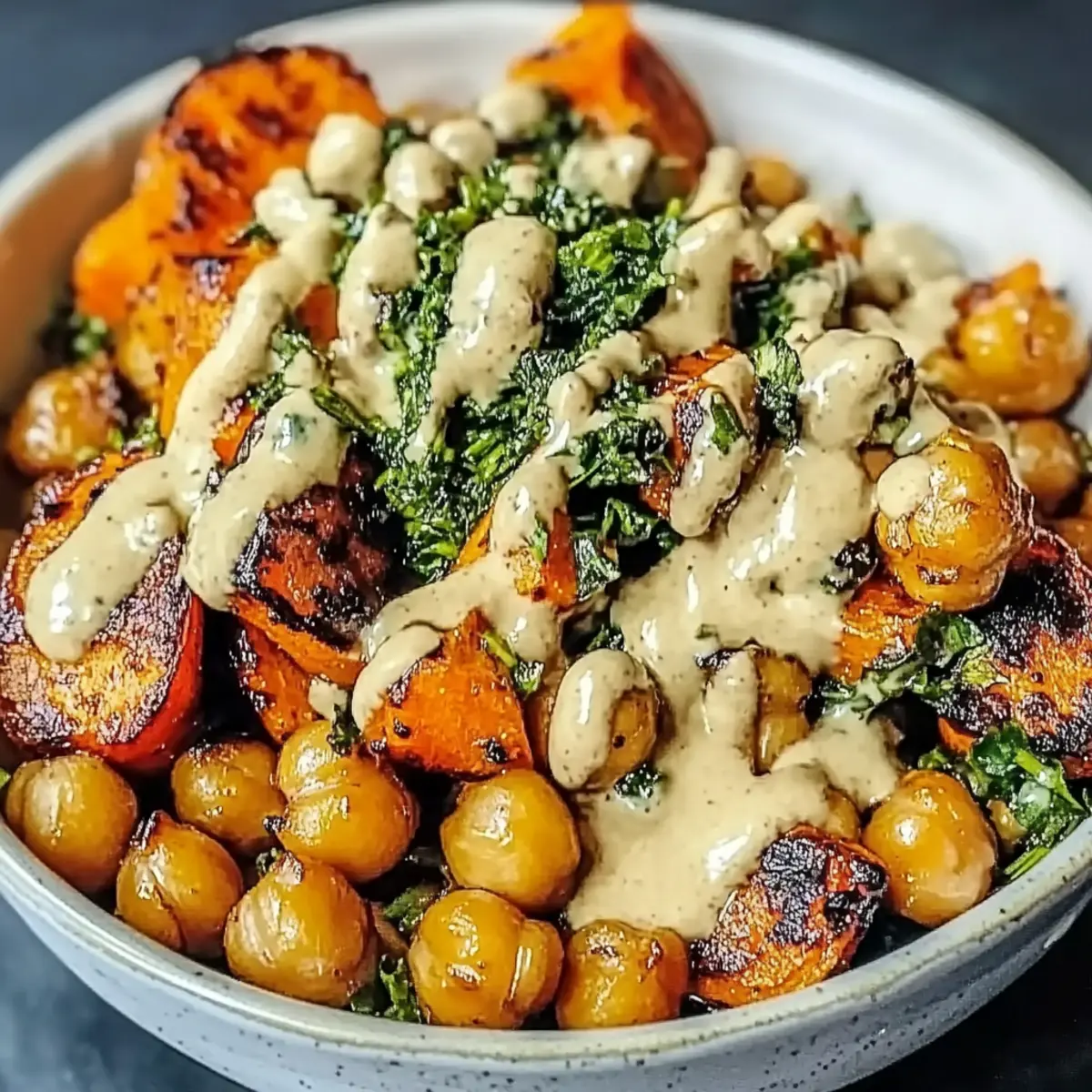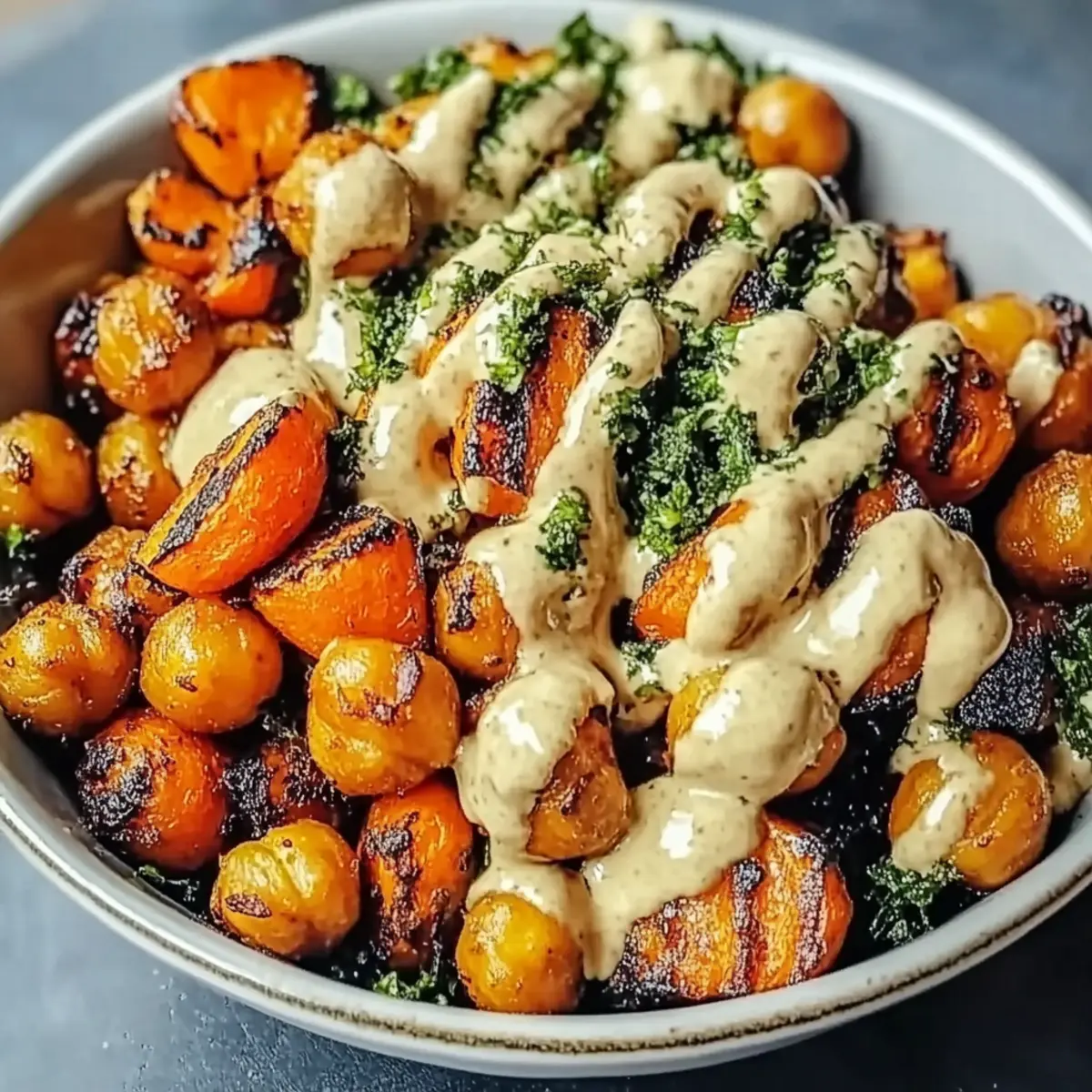 - Assemble bowls by placing roasted vegetables and drizzling with tahini dressing.