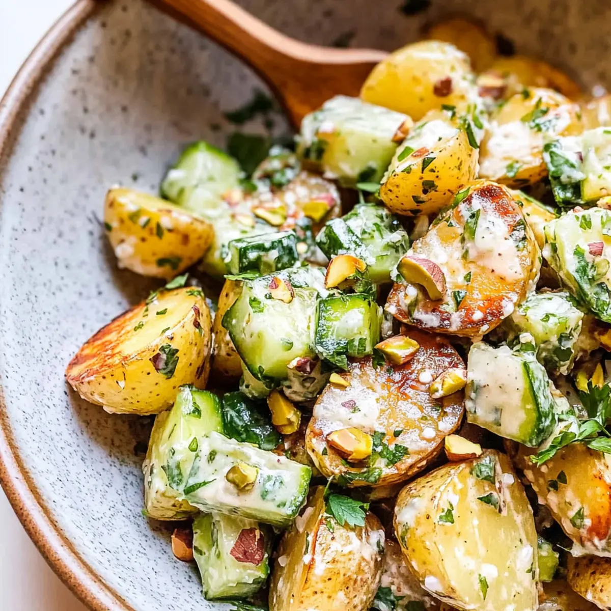 While the potatoes are roasting, grab a large mixing bowl and combine the chopped green onions, cucumber, pistachios, fresh dill, and parsley. Toss gently to mix these colorful ingredients, allowing their fresh flavors to meld together—this will contribute to the delightful texture of your roasted potato salad.