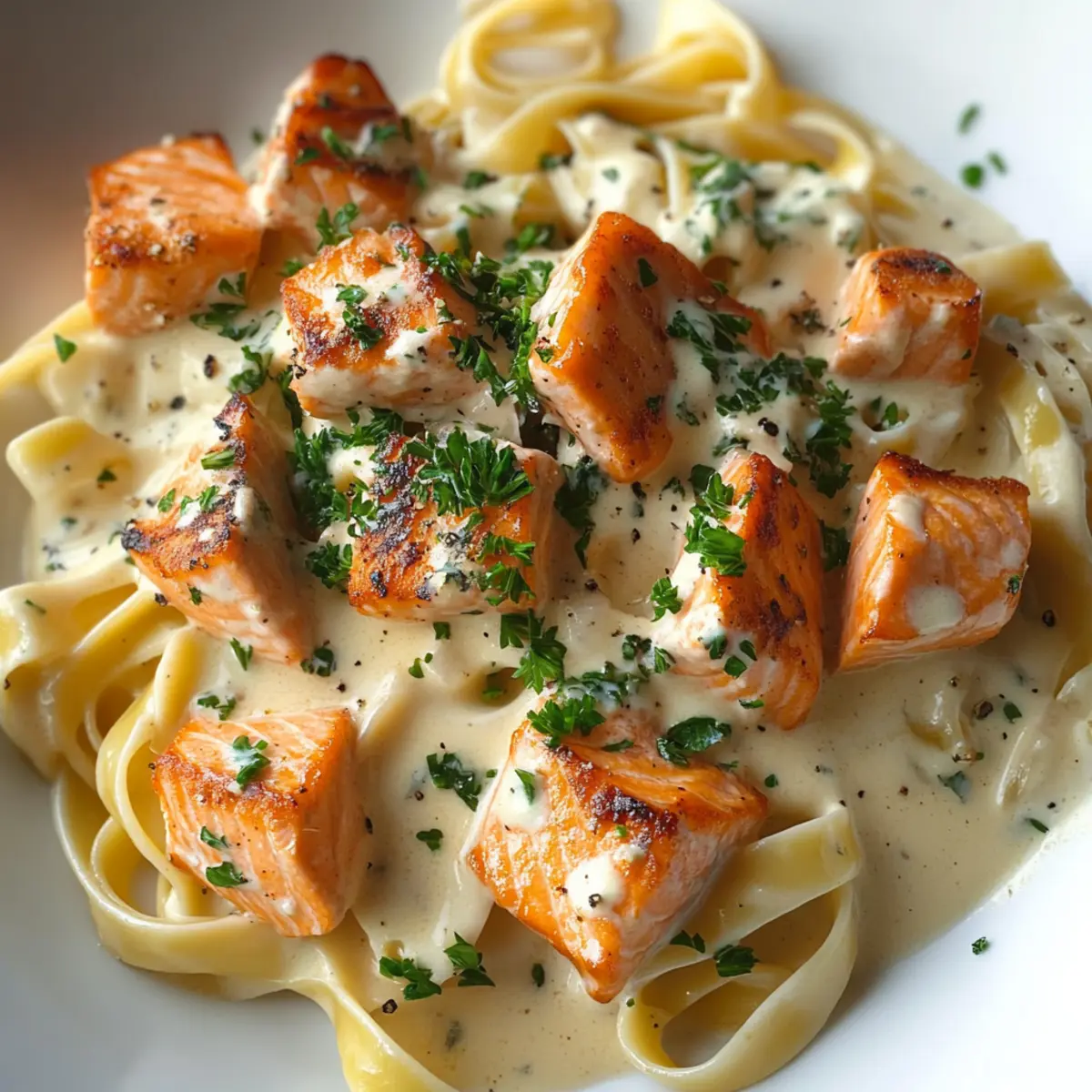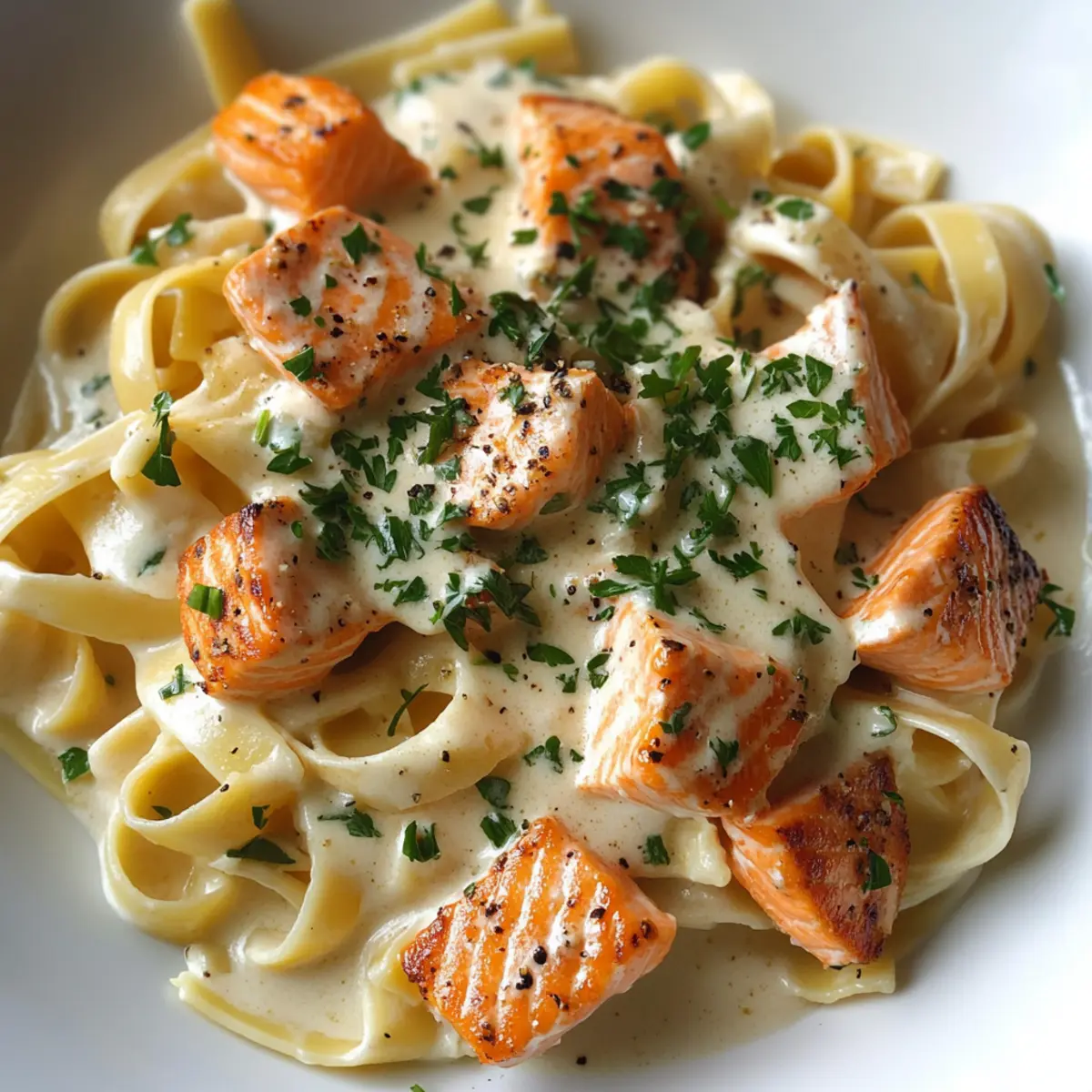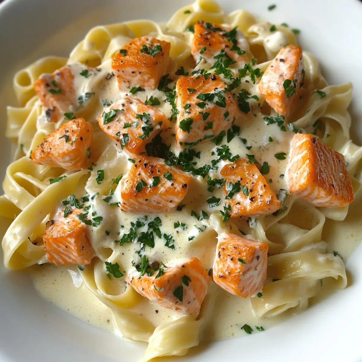Plate your Salmon Alfredo pasta by adding the creamy mixture to serving dishes. Top each portion with the seared salmon cubes and a sprinkle of freshly chopped parsley for a pop of color. For an extra touch of indulgence, feel free to add more grated parmesan on top. Serve immediately for a cozy and satisfying dinner!