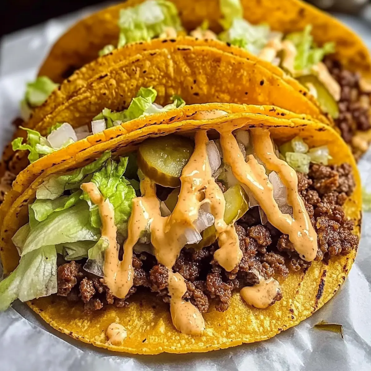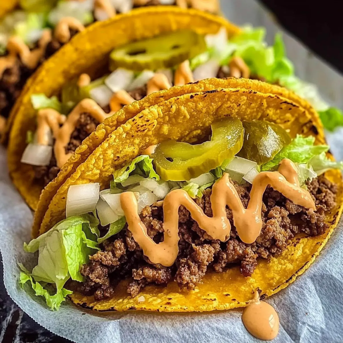 After the cheese has melted and the tortilla is perfectly crisp, remove the taco from the skillet. Now, it’s time to assemble! Spread your homemade burger sauce generously over the top, then sprinkle with fresh lettuce, diced onions, and pickles. This adds layers of texture and flavor, elevating your Smash Burger Tacos even further.