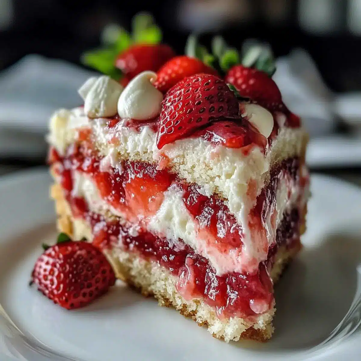 To finish, garnish your frosted cake with additional diced strawberries for a fresh touch. If you wish, serve each slice with a scoop of vanilla ice cream on the side, enhancing the dessert’s creamy richness. Your guests will be thrilled to enjoy this delightful Strawberry Earthquake Cake!