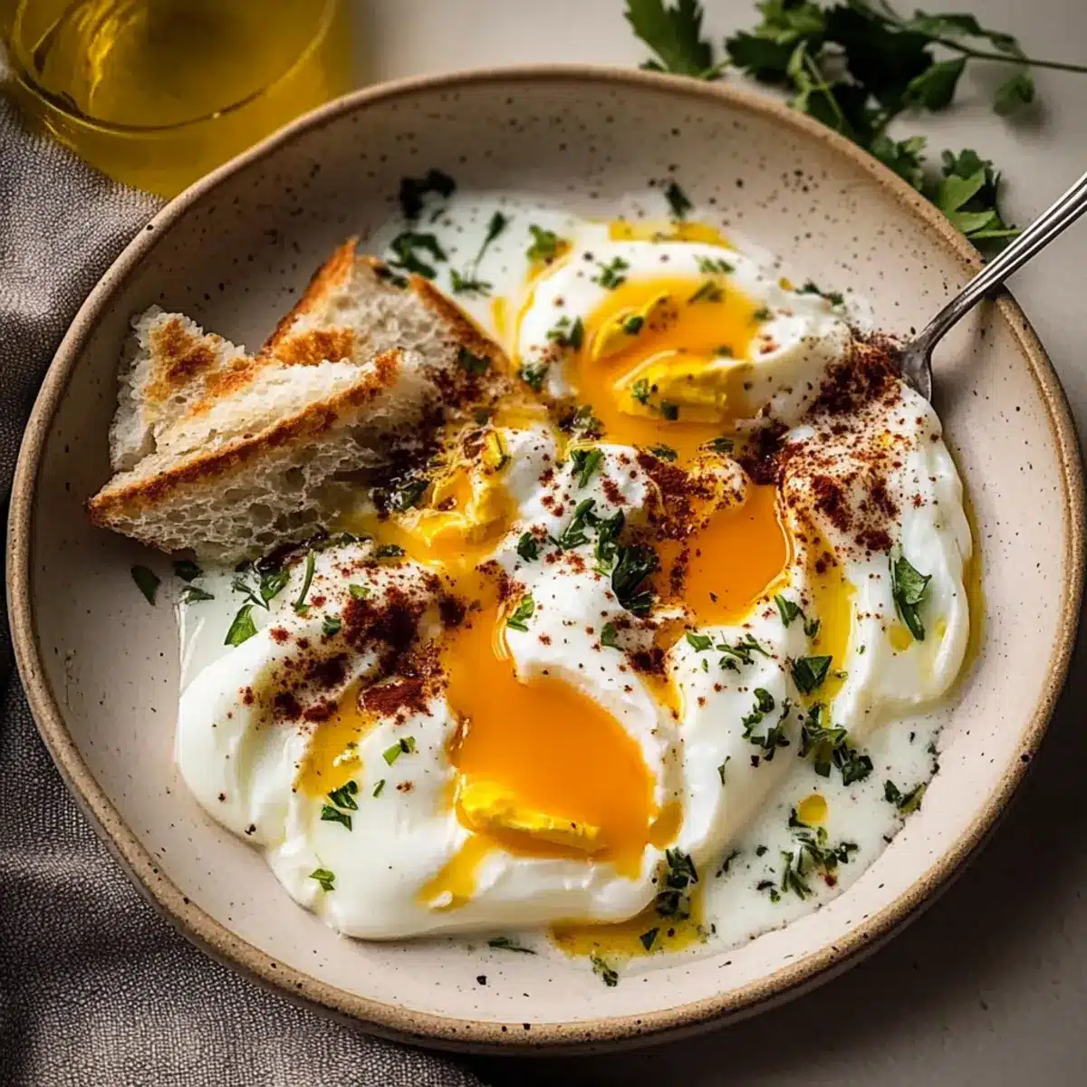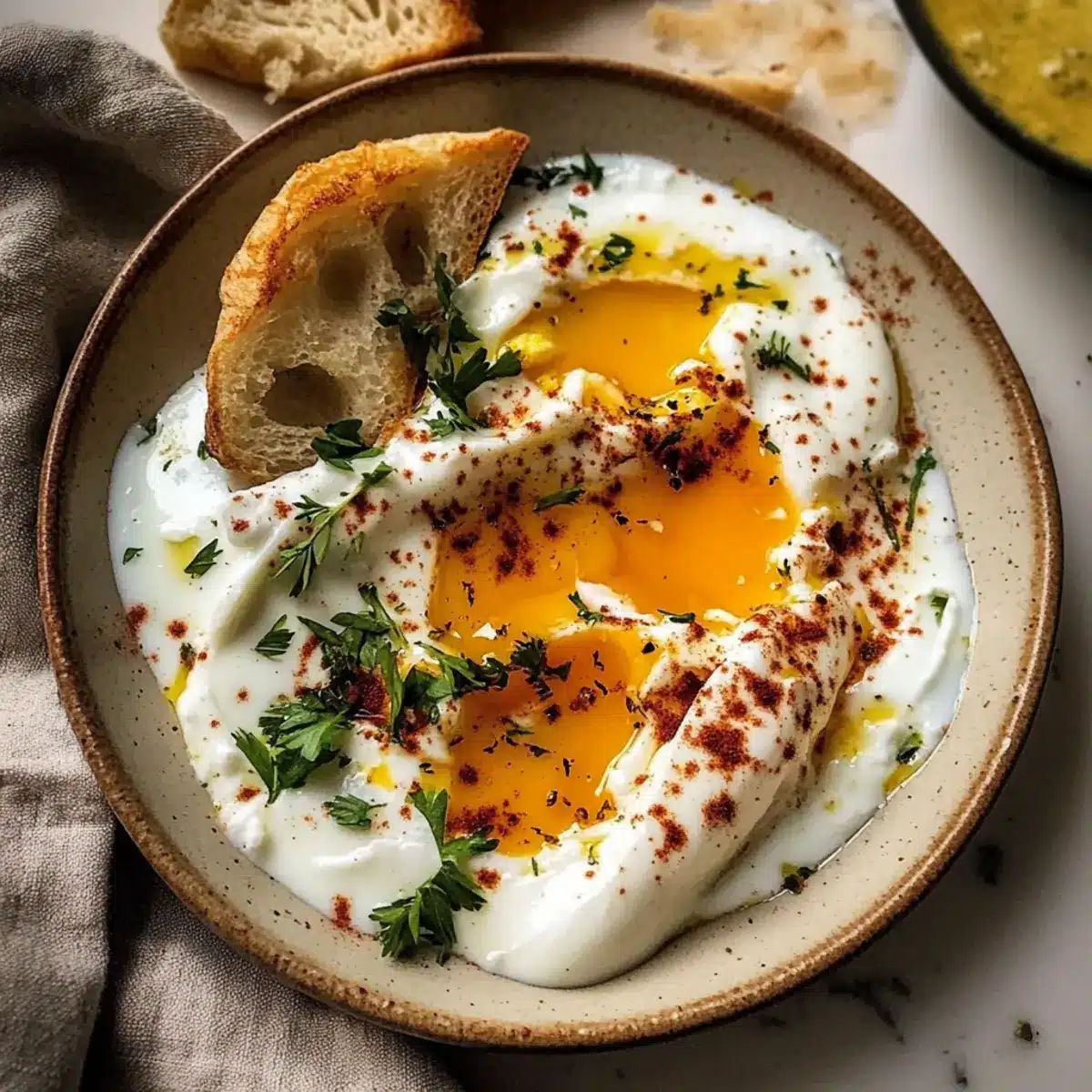 In shallow bowls, generously spoon the prepared herbed yogurt as the base. Carefully place two poached eggs on top of the yogurt in each bowl. Drizzle the warm, spiced butter sauce over the eggs and sprinkle with flaky sea salt and freshly cracked black pepper to taste. For an extra burst of flavor, garnish with additional dill or mint before serving with warm pita or crusty bread, making this Turkish Eggs with Creamy Yogurt & Butter Sauce the perfect cozy brunch dish.