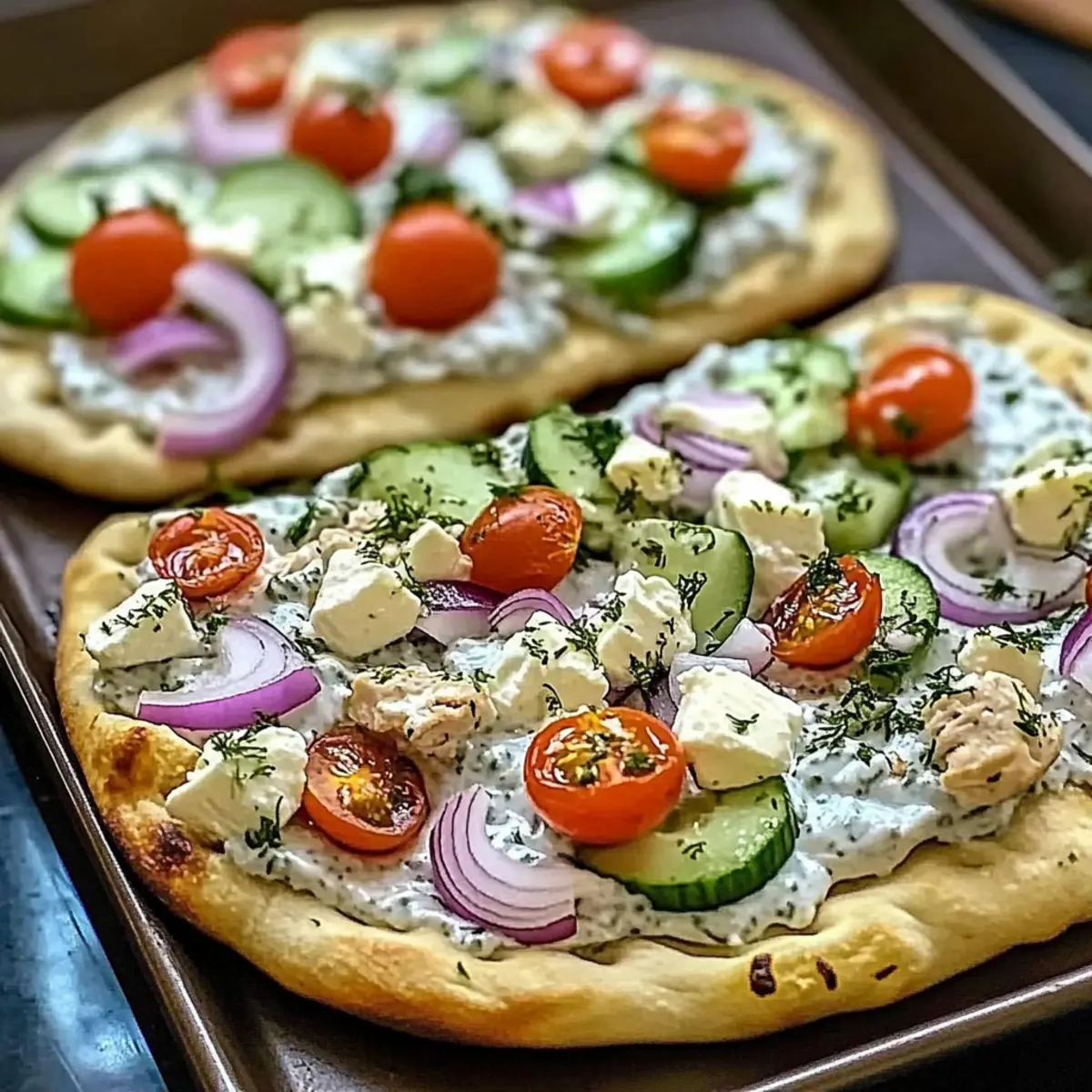 Sprinkle crumbled feta cheese generously over the top of your layered naan pizzas, adding a tangy, salty kick. Season with dried oregano, salt, and pepper to taste. These seasonings enhance the experience and balance the richness of the tzatziki and cheese beautifully.