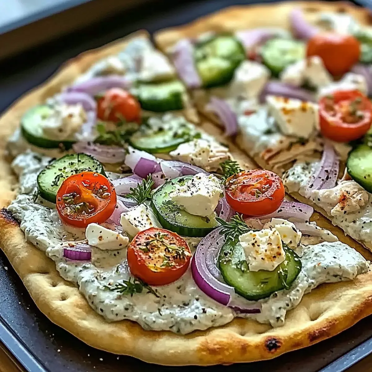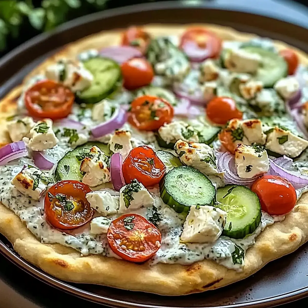 Vegan Option: For a fully vegan pizza, use plant-based yogurt for tzatziki and omit the feta cheese entirely for a fresh and lively flavor.