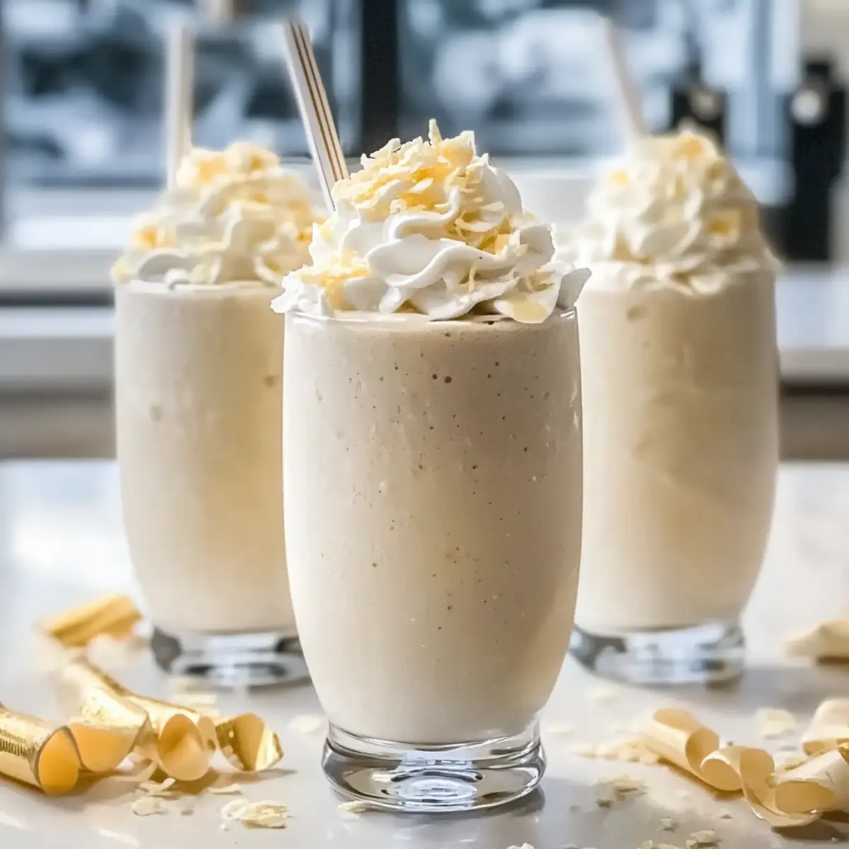 - Combine Ingredients in Blender: In a blender, add the melted white chocolate, banana, Greek yogurt, milk, vanilla extract, and shredded coconut.